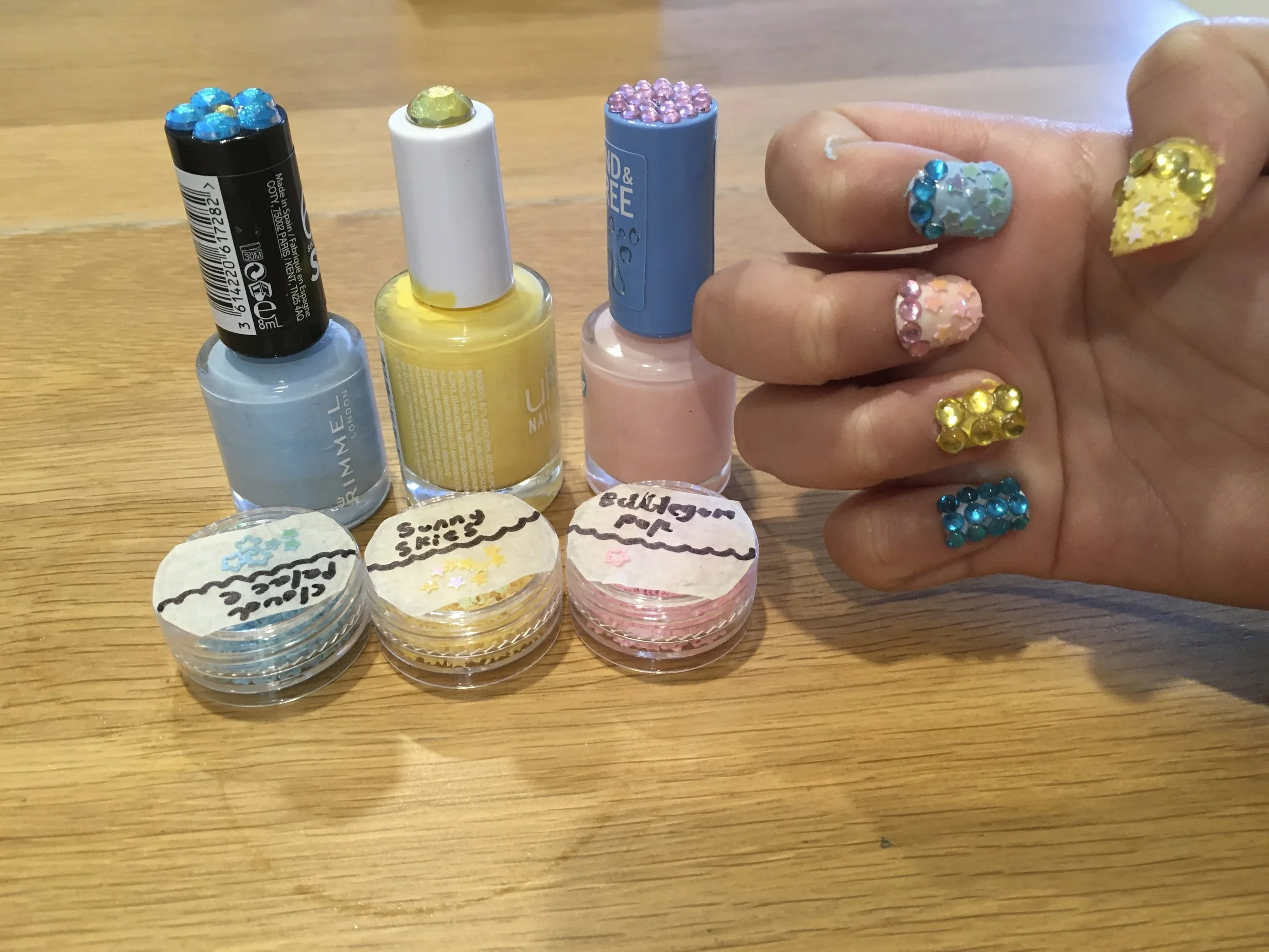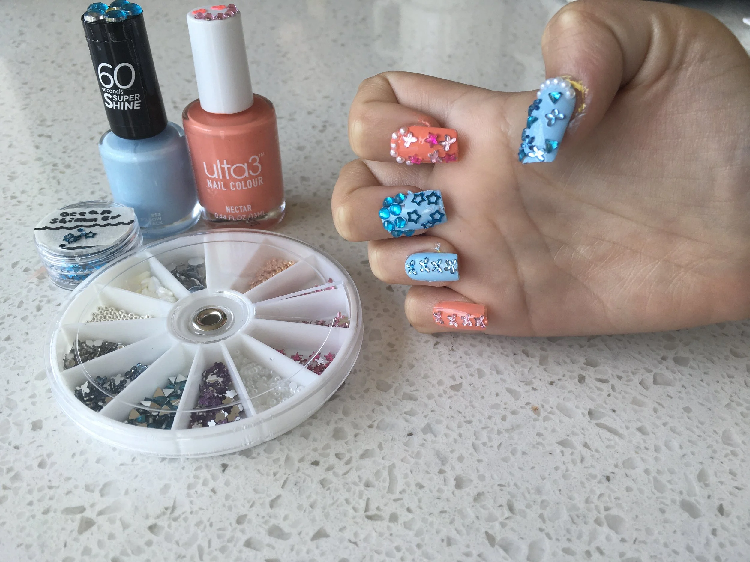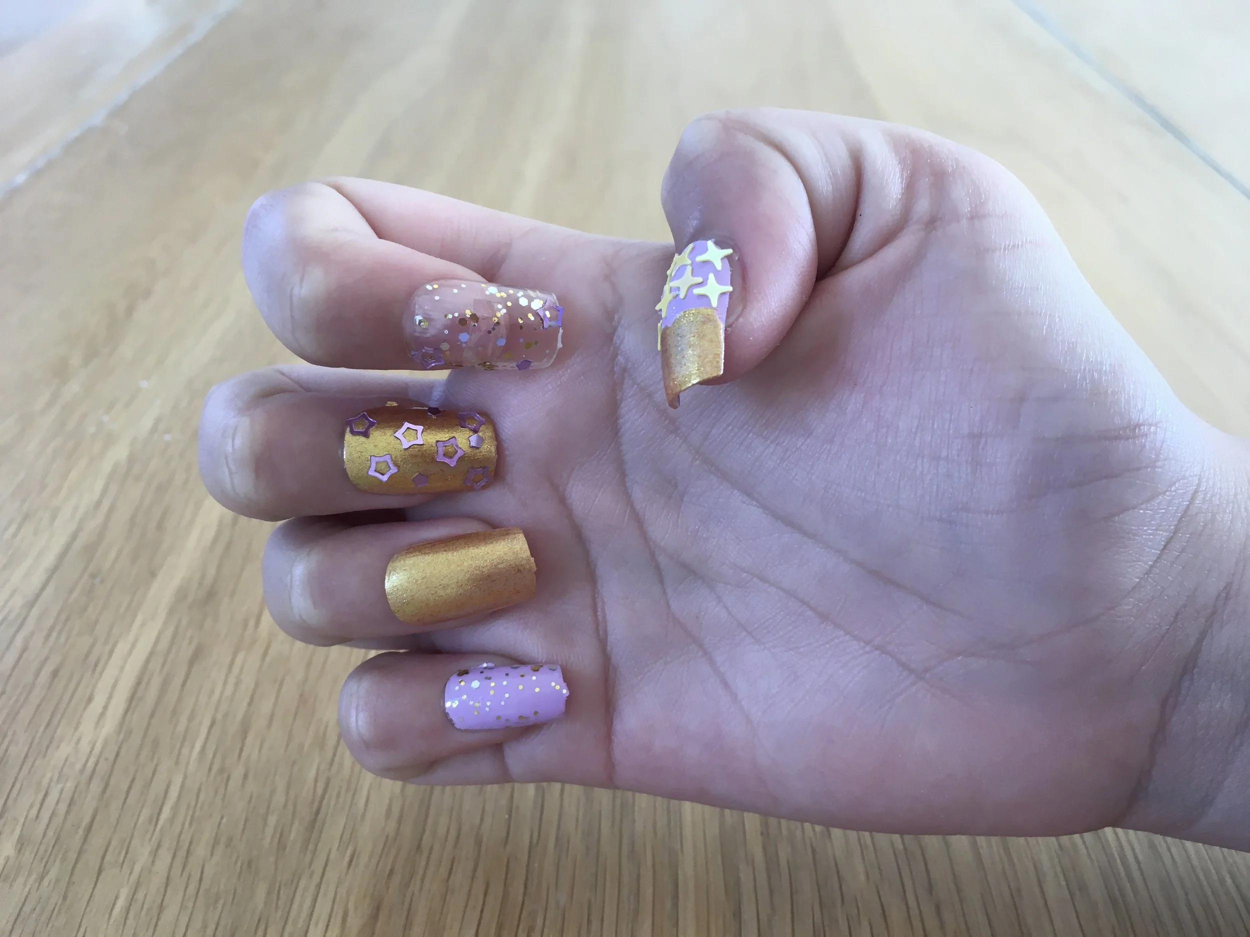 For this set, I used OXX Studio square nail tips, and Sally Hansen colour 559 Lacey Lilac, as well as Miniso’s Golden Cap collection with colour 12 Starlight Gold. I used glitter colours Daisies and Lavender Star. I really love how these came out.